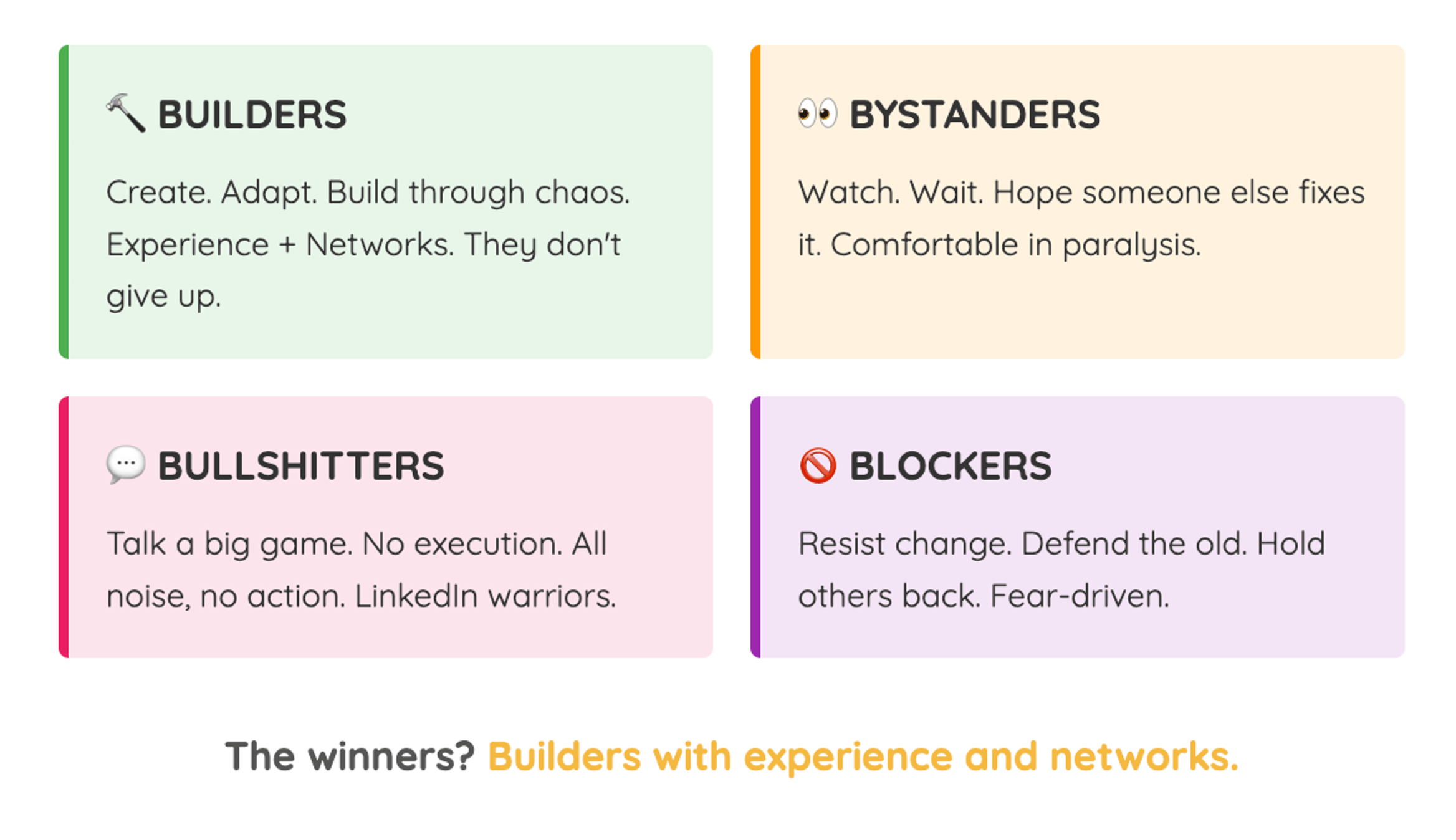 This is the final piece. When things get hard—and they will—Builders don't give up.They've failed before. They know what it feels like to lose a job, to have a project fail, to be told "no." And they know that failure isn't the end. It's information. It's a chance to rebuild stronger, wiser, healthier. Bystanders give up at the first sign of difficulty. Bullshitters disappear when things get real. Blockers double down on the old way.
